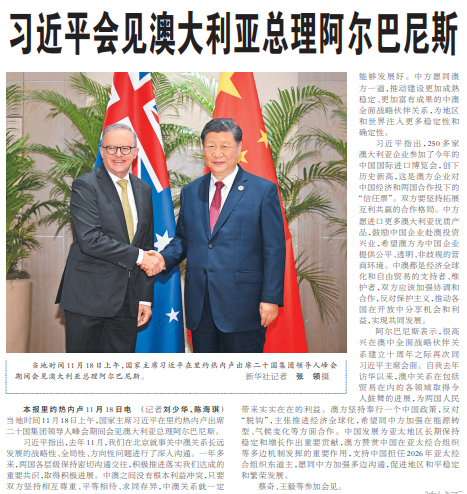 当地时间11月18日上午,国家主席习近平在里约热内卢出席二十国集团领导人峰会期间会见澳大利亚总理阿尔巴尼斯。(今日《人民日报》1版)