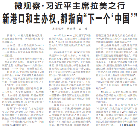 习近平主席秘鲁行程里的两件事,一件牵系双边合作,一件事关亚太“大家庭”走势,实则它们有一个共同指向,那就是“下一个‘中国’”和世界的关系。(今日《人民日报》1版、4版)