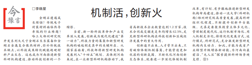 金刚石遭遇成长烦恼?传统电子封装材料面临热导率低的行业难题?哈工大郑州研究院开发系列大尺寸金刚石生长装备和金刚石金属复合散热材料,弥补传统技术缺点,以科技成果转化赋能超硬材料产业生态。这也成为河南推进新型科研机构建设、推动科技创新的一个缩影。(今日《河南日报》1版)