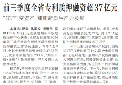 11月18日,记者从省知识产权维权保护中心获悉,我省近日发布2024年前三季度全省专利质押融资和商标质押融资工作情况通报。今年1至9月,全省专利质押融资金额达37.83亿元,较去年同期增长23.4%,“知识产权+金融”为我省新质生产力发展注入强劲动力。(今日《河南日报》1版)