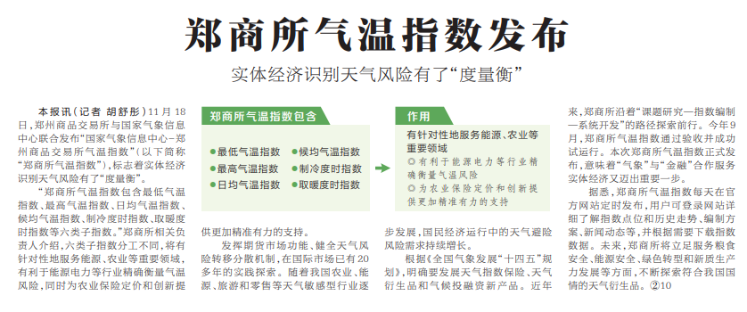 11月18日,郑州商品交易所与国家气象信息中心联合发布“国家气象信息中心-郑州商品交易所气温指数”,标志着实体经济识别天气风险有了“度量衡”。(今日《河南日报》2版)