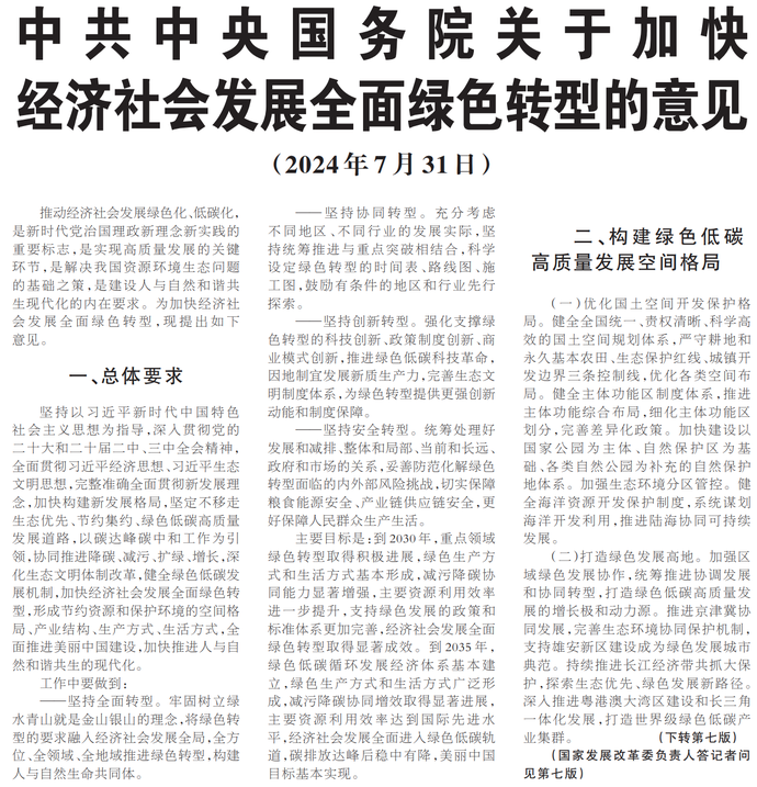 推动经济社会发展绿色化、低碳化,是新时代党治国理政新理念新实践的重要标志,是实现高质量发展的关键环节,是解决我国资源环境生态问题的基础之策,是建设人与自然和谐共生现代化的内在要求。为加快经济社会发展全面绿色转型,现提出如下意见。(今日《人民日报》1版、7版)