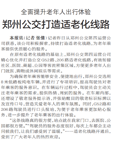 记者昨日从郑州公交第四运营公司获悉,该公司积极探索,持续打造适老化线路,为老年乘客提供优质暖心的服务。(今日《郑州日报》1版)
