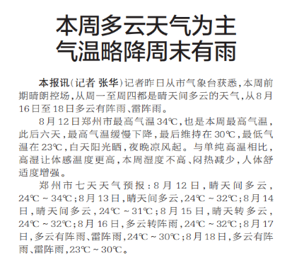 记者昨日从市气象台获悉,本周前期晴朗控场,从周一至周四都是晴天间多云的天气,从8月16日至18日多云有阵雨、雷阵雨。(今日《郑州日报》1版)