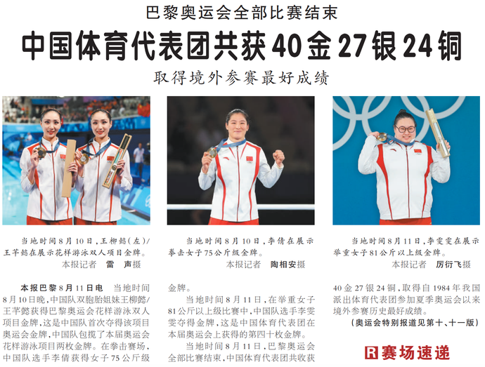 当地时间8月10日晚,中国队双胞胎姐妹王柳懿/王芊懿获得巴黎奥运会花样游泳双人项目金牌,这是中国队首次夺得该项目奥运会金牌,中国队包揽了本届奥运会花样游泳项目两枚金牌。在拳击赛场,中国队选手李倩获得女子75公斤级金牌。(今日《人民日报》1版、10版、11版)