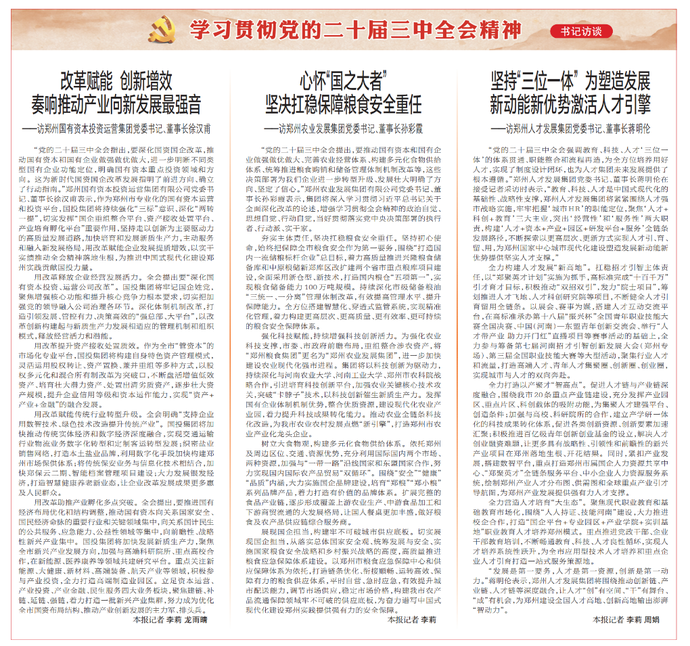 “党的二十届三中全会指出,要深化国资国企改革,推动国有资本和国有企业做强做优做大,进一步明晰不同类型国有企业功能定位,明确国有资本重点投资领域和方向。这为新时代国资国企改革发展指明了前进方向、确立了行动指南。”郑州国有资本投资运营集团有限公司党委书记、董事长徐汉甫表示,作为郑州市专业化的国有资本运营和投资平台,国投集团将持续强化“三标”意识、深化“两转一提”,切实发挥“国企重组整合平台、资产接收处置平台、产业培育孵化平台”重要作用,坚持走以创新为主要驱动力的高质量发展道路,加快培育和发展新质生产力,主动服务和融入新发展格局,用改革赋能企业发展提质增效,以实干实绩推动全会精神落地生根,为推进中国式现代化建设郑州实践贡献国投力量。(今日《郑州日报》2版)