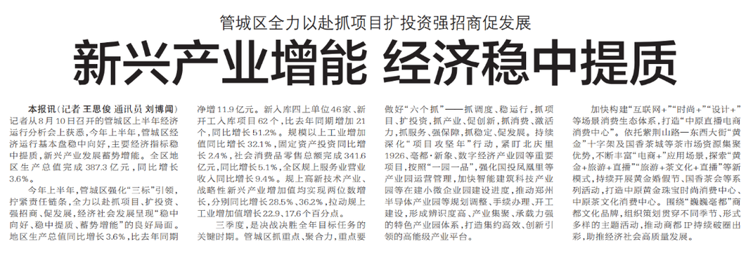 记者从8月10日召开的管城区上半年经济运行分析会上获悉,今年上半年,管城区经济运行基本盘稳中向好,主要经济指标稳中提质,新兴产业发展蓄势增能。全区地区生产总值完成387.3亿元,同比增长3.6%。(今日《郑州日报》5版)