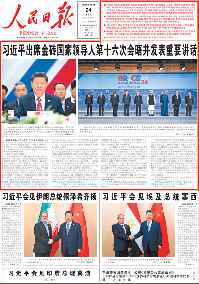 当地时间10月23日上午,金砖国家领导人第十六次会晤在喀山会展中心举行。俄罗斯总统普京主持会晤。中国国家主席习近平、巴西总统卢拉(线上)、埃及总统塞西、埃塞俄比亚总理阿比、印度总理莫迪、伊朗总统佩泽希齐扬、南非总统拉马福萨、阿联酋总统穆罕默德等出席。(今日《人民日报》1版)
