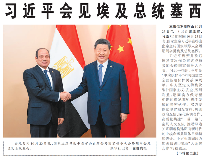 当地时间10月23日晚,国家主席习近平在喀山出席金砖国家领导人会晤期间会见埃及总统塞西。(今日《人民日报》1版、2版)