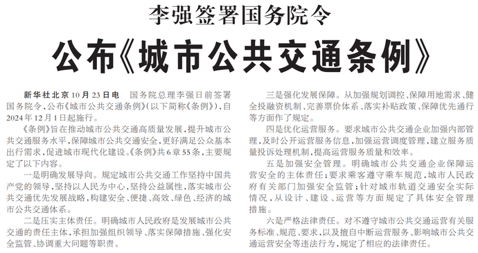 国务院总理李强日前签署国务院令,公布《城市公共交通条例》(以下简称《条例》),自2024年12月1日起施行。(今日《人民日报》3版)