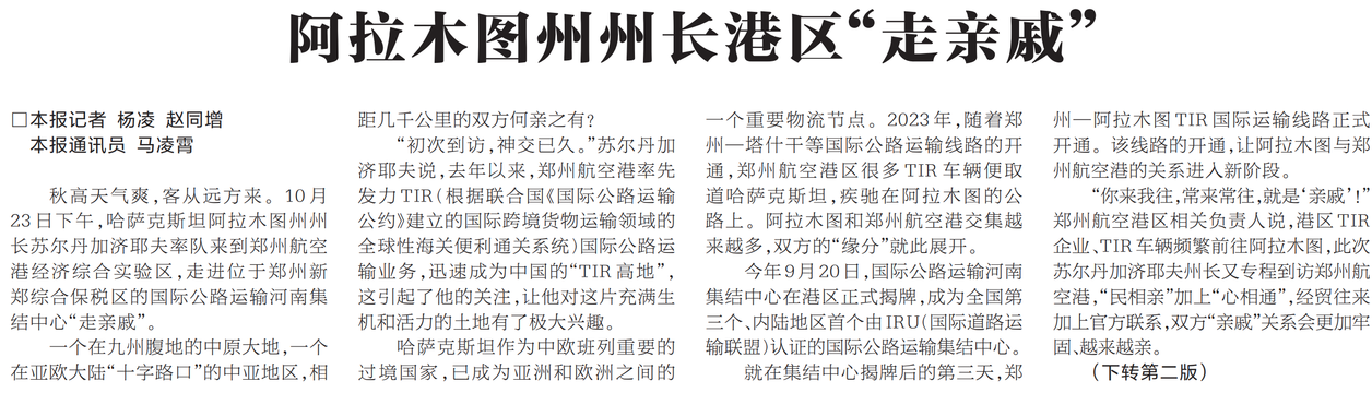 秋高天气爽,客从远方来。10月23日下午,哈萨克斯坦阿拉木图州州长苏尔丹加济耶夫率队来到郑州航空港经济综合实验区,走进位于郑州新郑综合保税区的国际公路运输河南集结中心“走亲戚”。(今日《河南日报》1版、2版)