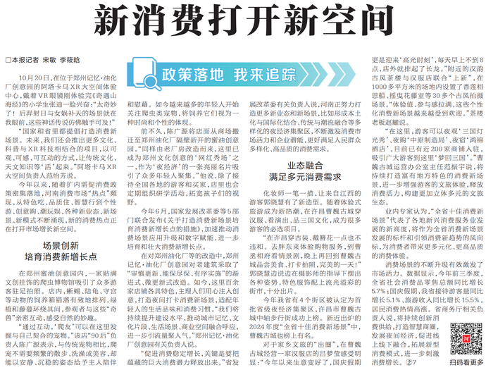 10月20日,在位于郑州记忆·油化厂创意园的阿塔卡马XR大空间体验中心,戴着VR眼镜刚体验完《奇遇山海经》的小学生张迪一脸兴奋:“太奇妙了!后羿射日与女娲补天的场景就在我眼前,这些神话传说仿佛触手可及!”(今日《河南日报》3版)