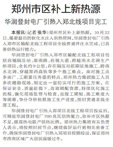 郑州市区补上新热源。10月22日,随着最后的软化水注入供热管网,华润登封电厂引热入郑市区输配北线工程项目全线贯通并注水完成,已具备供热运行能力。(今日《郑州日报》1版)