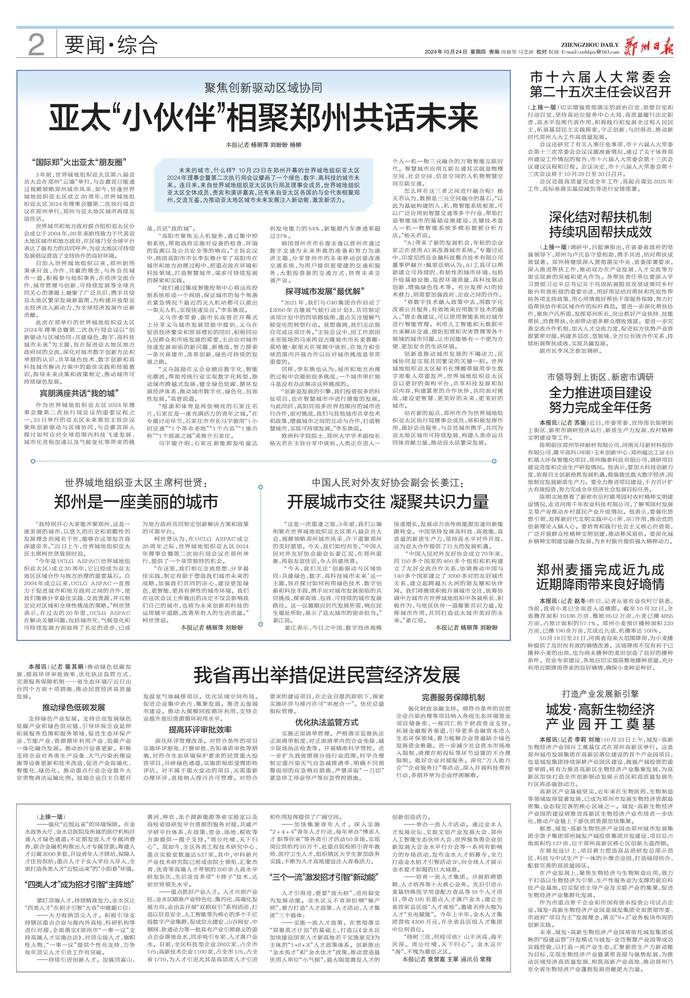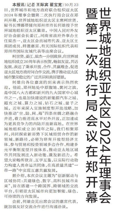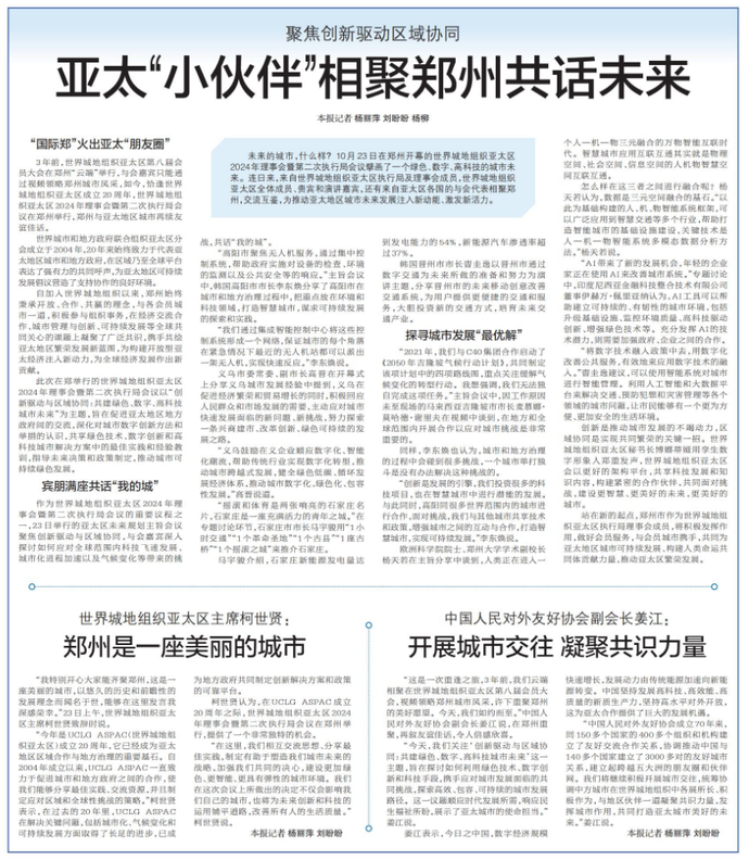 未来的城市,什么样?10月23日在郑州开幕的世界城地组织亚太区2024年理事会暨第二次执行局会议擘画了一个绿色、数字、高科技的城市未来。连日来,来自世界城地组织亚太区执行局及理事会成员,世界城地组织亚太区全体成员、贵宾和演讲嘉宾,还有来自亚太区各国的与会代表相聚郑州,交流互鉴,为推动亚太地区城市未来发展注入新动能、激发新活力。(今日《郑州日报》2版)