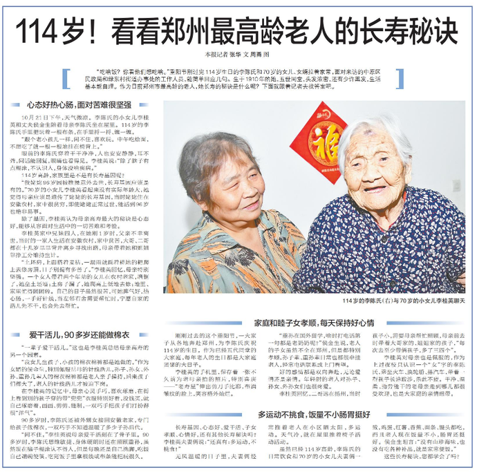 “吃啥饭?你看他们想吃啥。”重阳节刚过完114岁生日的李陈氏和70岁的女儿、女婿拉着家常,面对来访的中原区民政局和绿东村街道办事处的工作人员,能简单回应几句。生于1910年的她,五世同堂,头发浓密,还有少许黑发,生活基本能自理。作为目前郑州市最高龄的老人,她长寿的秘诀是什么呢?下面就跟着记者去找答案吧。(今日《郑州日报》5版)