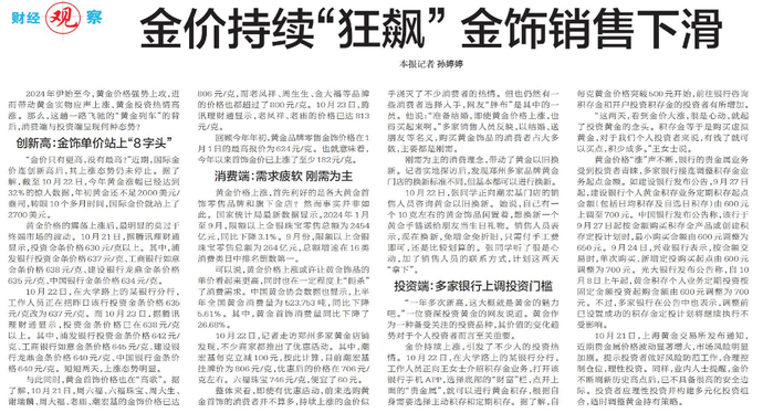 2024年伊始至今,黄金价格强势上攻,进而带动黄金实物应声上涨、黄金投资热情高涨。那么,这趟一路飞驰的“黄金列车”的背后,消费端与投资端呈现何种态势?(今日《郑州日报》6版)