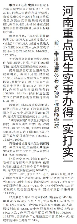 年初定下的重点民生实事进展如何?10月23日,记者从省政府办公厅获悉,我省发布《关于2024年前三季度省重点民生实事进展情况的通报》,截至9月底,全省10件重点民生实事整体进展顺利,多项目标超额完成。(今日《郑州日报》6版)