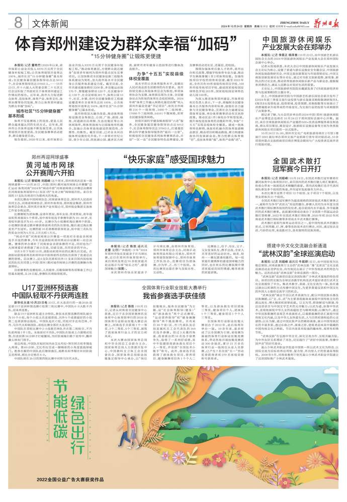2020年以来,省市体彩公益金共投入8370万元用于全民健身补短板工程;公共体育场馆开放率达100%,城市社区“15分钟健身圈”基本形成;全民健身基层健身指导站点达5012个,社会体育指导员达37843人,……10月23日,市十六届人大常委会第二十五次主任会议听取了市政府关于体育郑州建设工作情况的报告。近年来,我市大力促进群众体育、竞技体育、体育产业、体育文化、体育治理等协同发展,努力让体育郑州建设为群众幸福“加码”。(今日《郑州日报》8版)