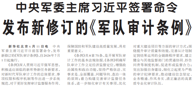 中央军委主席习近平日前签署命令,发布新修订的《军队审计条例》,自2024年7月1日起施行。(今日《人民日报》1版)