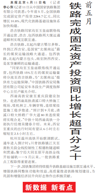 记者11日从中国国家铁路集团有限公司获悉:今年前5月,全国铁路完成固定资产投资2284.7亿元,同比增长10.8%,现代化铁路基础设施体系加快构建。(今日《人民日报》1版)