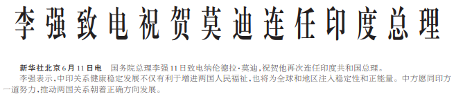 国务院总理李强11日致电纳伦德拉·莫迪,祝贺他再次连任印度共和国总理。(今日《人民日报》1版)