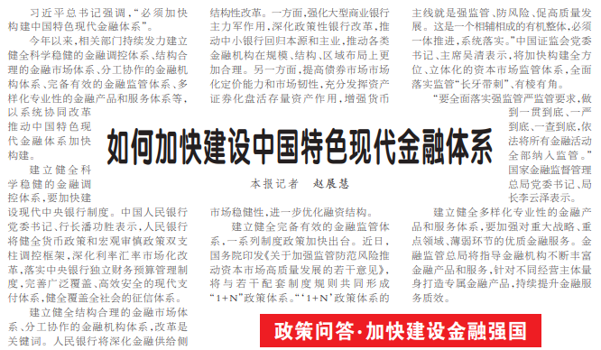 今年以来,相关部门持续发力建立健全科学稳健的金融调控体系、结构合理的金融市场体系、分工协作的金融机构体系、完备有效的金融监管体系、多样化专业性的金融产品和服务体系等,以系统协同改革推动中国特色现代金融体系加快构建。(今日《人民日报》1版)