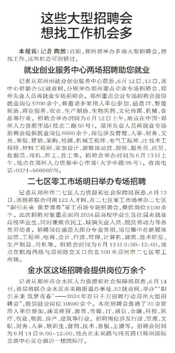 近期,郑州将举办多场大型招聘会,想找工作,这些机会可别错过。(今日《郑州日报》2版)