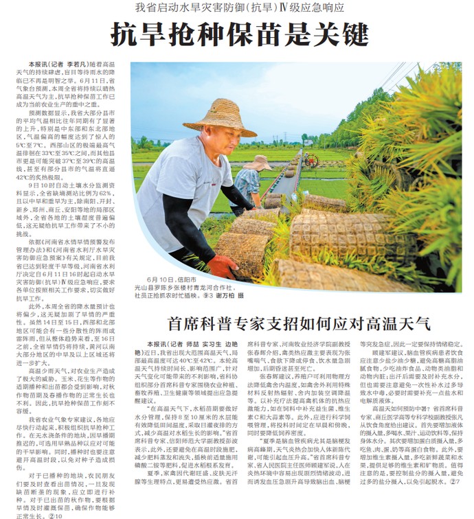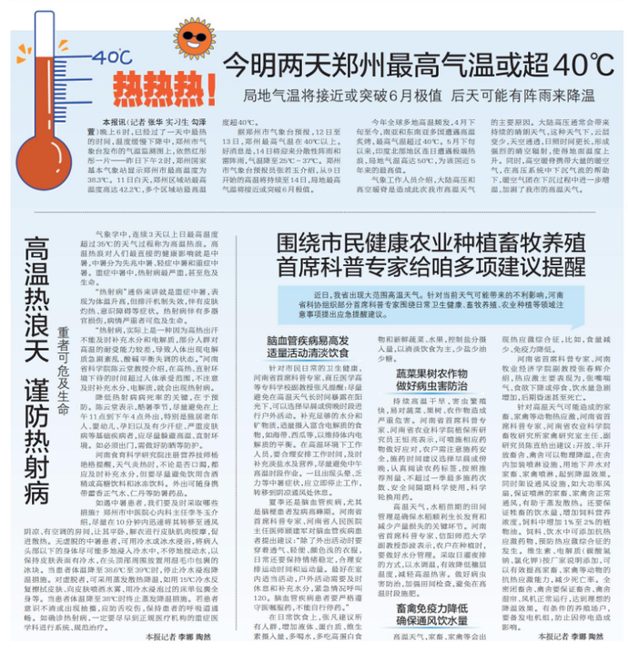 近日,我省出现大范围高温天气。针对当前天气可能带来的不利影响,河南省科协组织部分首席科普专家围绕日常卫生健康、畜牧养殖、农业种植等领域注意事项提出应急提醒建议。(今日《郑州日报》2版)
