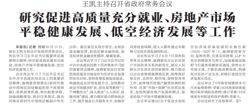 6月11日,省长王凯主持召开省政府常务会议,传达学习习近平总书记重要讲话重要指示精神,研究促进高质量充分就业、房地产市场平稳健康发展、低空经济发展等工作。(今日《河南日报》1版)