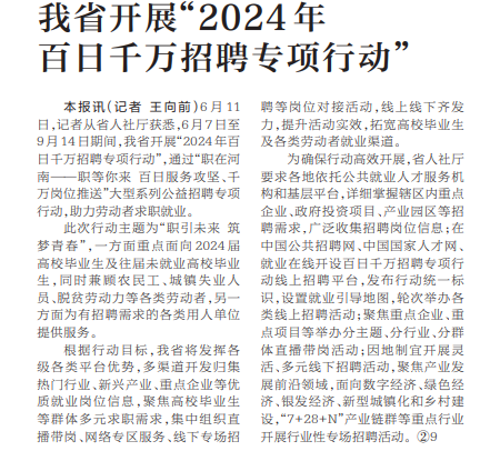6月11日,记者从省人社厅获悉,6月7日至9月14日期间,我省开展“2024年百日千万招聘专项行动”,通过“职在河南——职等你来 百日服务攻坚、千万岗位推送”大型系列公益招聘专项行动,助力劳动者求职就业。(今日《河南日报》1版)