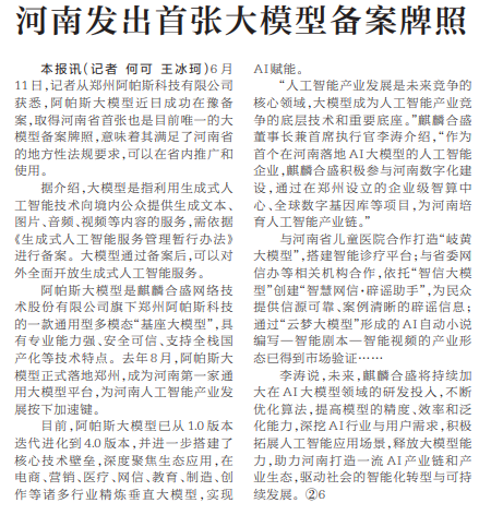 6月11日,记者从郑州阿帕斯科技有限公司获悉,阿帕斯大模型近日成功在豫备案,取得河南省首张也是目前唯一的大模型备案牌照,意味着其满足了河南省的地方性法规要求,可以在省内推广和使用。(今日《河南日报》1版)