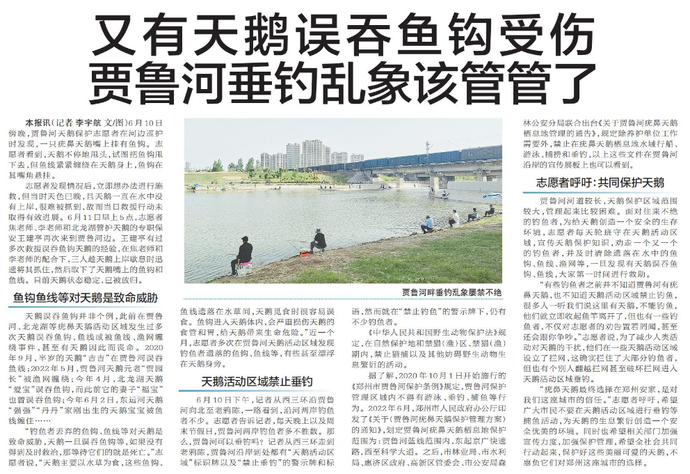 又有天鹅误吞鱼钩受伤 贾鲁河垂钓乱象该管管了