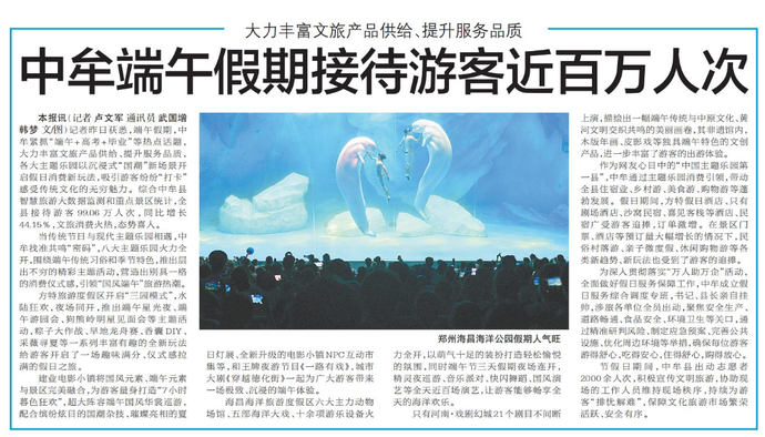 记者昨日获悉,端午假期,中牟紧抓“端午+高考+毕业”等热点话题,大力丰富文旅产品供给、提升服务品质,各大主题乐园以沉浸式“国潮”新场景开启假日消费新玩法,吸引游客纷纷“打卡”感受传统文化的无穷魅力。综合中牟县智慧旅游大数据监测和重点景区统计,全县接待游客99.06万人次,同比增长44.15%,文旅消费火热,态势喜人。(今日《郑州日报》7版)