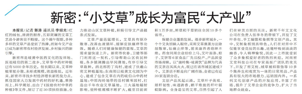 红红的绒包,清清的甜香,五彩斑斓的艾草工艺品令游客目不暇接。这个端午假期,多种多样的艾草产品受到了热捧,而如今艾产业已成为新密市农村经济发展、乡村振兴的新引擎。(今日《郑州日报》7版)