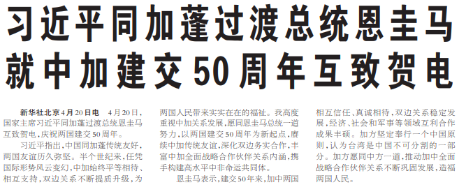 4月20日,国家主席习近平同加蓬过渡总统恩圭马互致贺电,庆祝两国建交50周年。(今日《人民日报》1版)