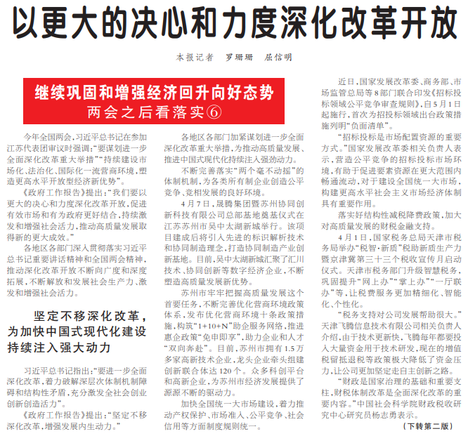 各地区各部门深入贯彻落实习近平总书记重要讲话精神和全国两会精神,推动深化改革开放不断向广度和深度拓展,不断解放和发展社会生产力、激发和增强社会活力。(今日《人民日报》1版、2版)