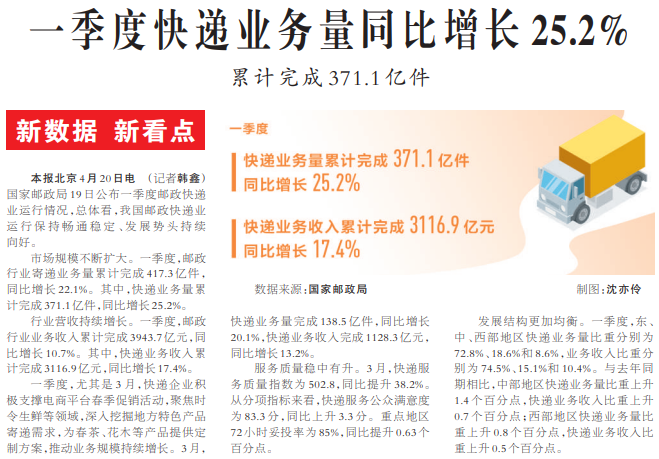 一季度快递业务量同比增长25.2%