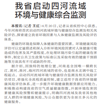 4月20日,记者从省疾控中心获悉,今年河南将首次启动四河流域环境与健康综合监测及相关风险评估,探索建立我省环境因素与人体健康监测及风险评估体系。(今日《郑州日报》1版)
