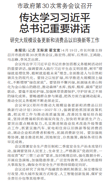 4月19日,市长何雄主持召开市政府第30次常务会议,陈宏伟、胡军、石秀田、王鸿勋、马志峰、李凤芝出席。(今日《郑州日报》1版)