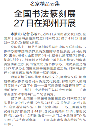 记者昨日从河南省文联获悉,全国第十三届书法篆刻展览(河南展区)将于4月27日在郑州美术馆(新馆)启幕。(今日《郑州日报》1版)