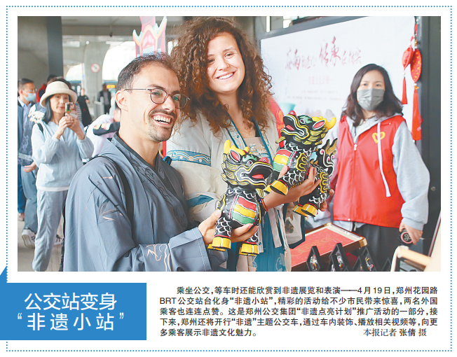 乘坐公交,等车时还能欣赏到非遗展览和表演——4月19日,郑州花园路BRT公交站台化身“非遗小站”,精彩的活动给不少市民带来惊喜,两名外国乘客也连连点赞。这是郑州公交集团“非遗点亮计划”推广活动的一部分,接下来,郑州还将开行“非遗”主题公交车,通过车内装饰、播放相关视频等,向更多乘客展示非遗文化魅力。(今日《郑州日报》1版)