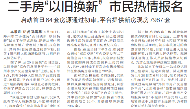4月20日,郑州市二手住房“卖旧买新、以旧换新”试点工作正式启动,记者从市住房保障和房地产管理局了解到,报名首日,共有64套房源通过初步审核,目前1组已进入现场踏勘环节,1组已进入评估环节。(今日《郑州日报》1版)
