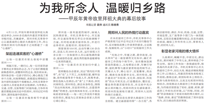4月11日,甲辰年黄帝故里拜祖大典成功举办,5000余名海内外嘉宾齐聚郑州寻根问祖、共襄盛举。郑州市机关事务中心以最真诚的心做好大典接待工作,用心用情在郑州与四海游子之间搭建了一座“心通桥”。(今日《郑州日报》2版)