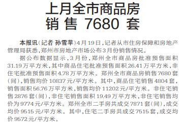 4月19日,记者从市住房保障和房地产管理局获悉,郑州市房地产市场公布3月份销售情况。(今日《郑州日报》2版)