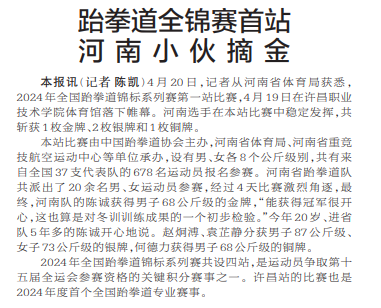 4月20日,记者从河南省体育局获悉,2024年全国跆拳道锦标系列赛第一站比赛,4月19日在许昌职业技术学院体育馆落下帷幕。河南选手在本站比赛中稳定发挥,共斩获1枚金牌、2枚银牌和1枚铜牌。(今日《郑州日报》2版)