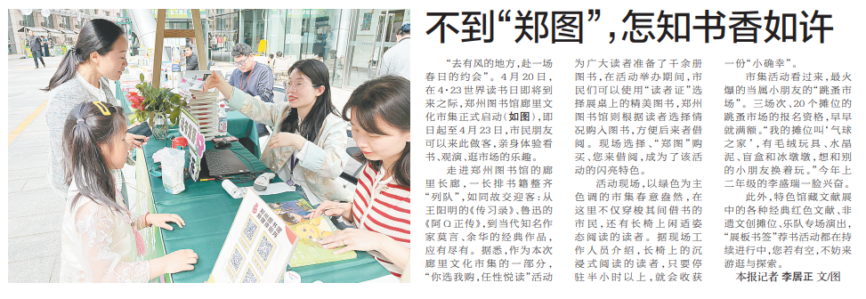 “去有风的地方,赴一场春日的约会”。4月20日,在4·23世界读书日即将到来之际,郑州图书馆廊里文化市集正式启动,即日起至4月23日,市民朋友可以来此做客,亲身体验看书、观演、逛市场的乐趣。(今日《郑州日报》2版)