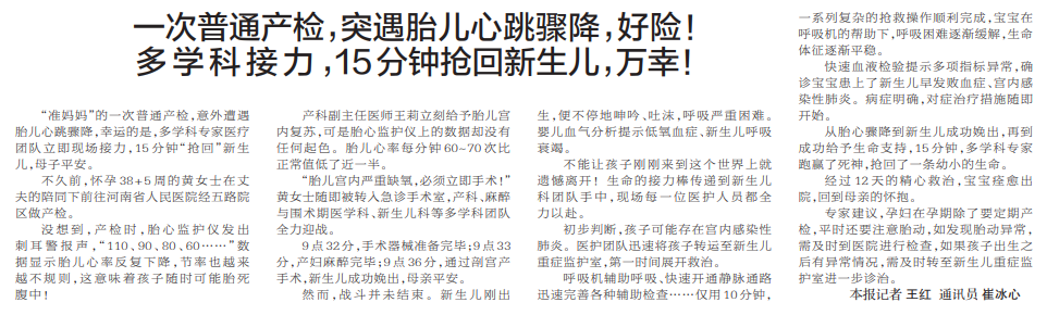 “准妈妈”的一次普通产检,意外遭遇胎儿心跳骤降,幸运的是,多学科专家医疗团队立即现场接力,15分钟“抢回”新生儿,母子平安。(今日《郑州日报》2版)