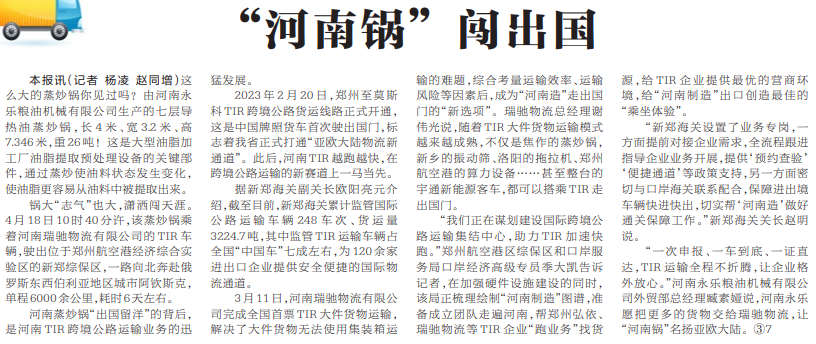 锅大“志气”也大,潇洒闯天涯。4月18日10时40分许,该蒸炒锅乘着河南瑞驰物流有限公司的TIR车辆,驶出位于郑州航空港经济综合实验区的新郑综保区,一路向北奔赴俄罗斯东西伯利亚地区城市阿钦斯克,单程6000余公里,耗时6天左右。(今日《河南日报》1版)