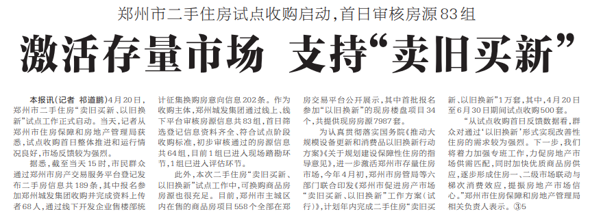 4月20日,郑州市二手住房“卖旧买新、以旧换新”试点工作正式启动。当天,记者从郑州市住房保障和房地产管理局获悉,试点收购首日整体推进和运行情况良好,市场反馈较为强烈。(今日《河南日报》3版)
