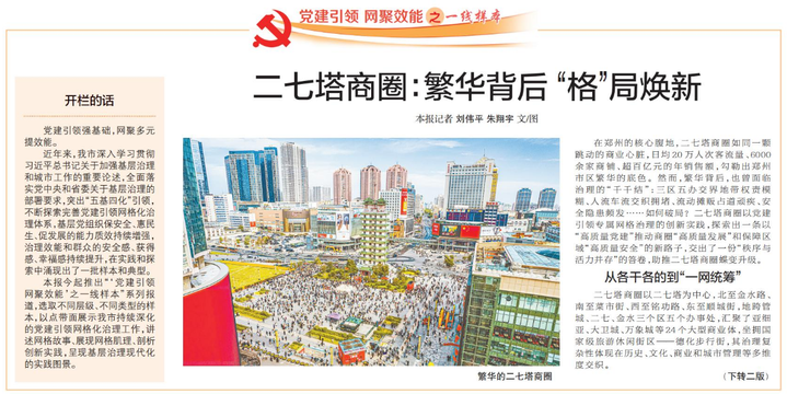 在郑州的核心腹地,二七塔商圈如同一颗跳动的商业心脏,日均20万人次客流量、6000余家商铺、超百亿元的年销售额,勾勒出郑州市区繁华的底色。然而,繁华背后,也曾面临治理的“千千结”:三区五办交界地带权责模糊、人流车流交织拥堵、流动摊贩占道顽疾、安全隐患频发……如何破局?二七塔商圈以党建引领专属网格治理的创新实践,探索出一条以“高质量党建”推动商圈“高质量发展”和保障区域“高质量安全”的新路子,交出了一份“秩序与活力并存”的答卷,助推二七塔商圈蝶变升级。(今日《郑州日报》1版、2版)